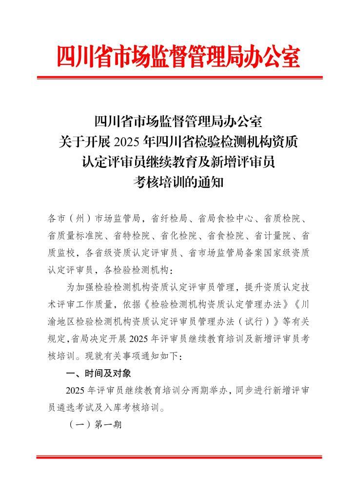 关于开展2025年四川省检验检测机构资质认定评审员继续教育及新增评审员考核培训的通知